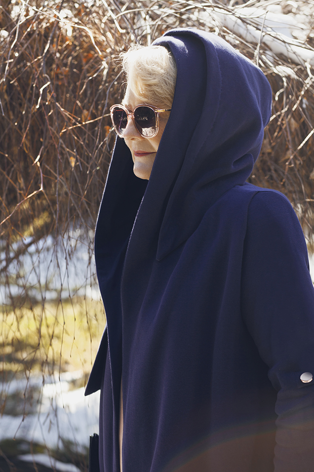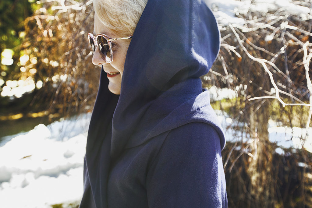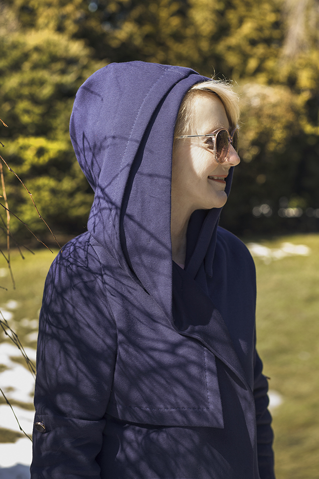 Jeśli jest cieplej, jeden z kapturów można zsunąć, co daje także bardzo ciekawy efekt, który jednocześnie poszerza (w moim przypadku to bardzo wskazane) wąskie ramiona.