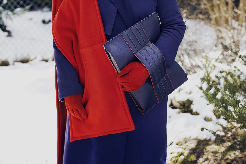 Szalem możemy dobrze otulić się w mroźne dni. Posiada kieszenie, w których dodatkowo można ogrzać ręce. Czerwone rękawiczki i granatowo-czerwona kopertówka to dodatki, które moim zdaniem podkreślają energetyczny charakter zestawu.