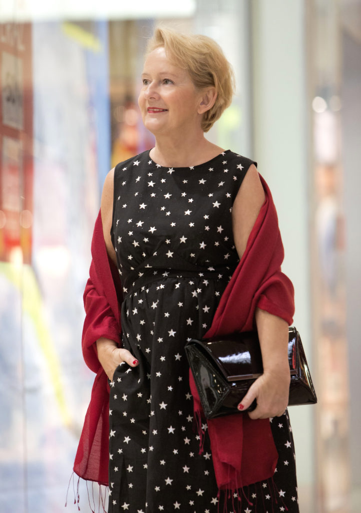 Sukienka bez rękawów ma wiele zalet. Jest przewiewna, co w czasie Wigilii przy kominku (tak było w moim przypadku) jest bardzo pożądane. Newralgiczne miejsca, które niestety posiada zazwyczaj dojrzała kobieta, można przykryć lekkim szalem, który kontrastowym kolorem ją ożywia (na zdjęciu poniżej).