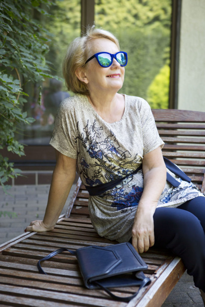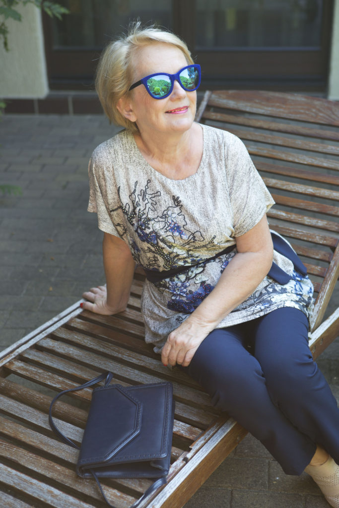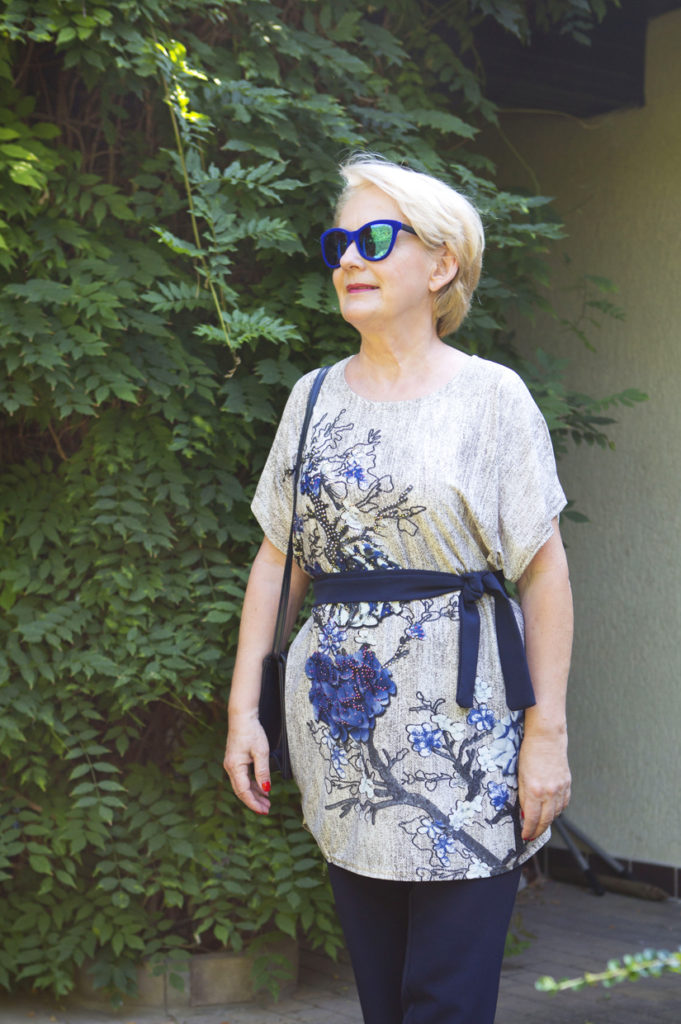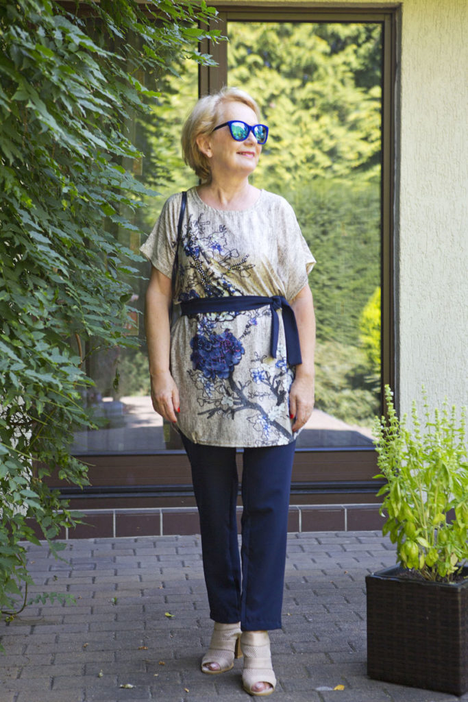 Przeładna jest ta tunika. Granatowe spodnie idealnie podkreśliły jej kwiatowy motyw.