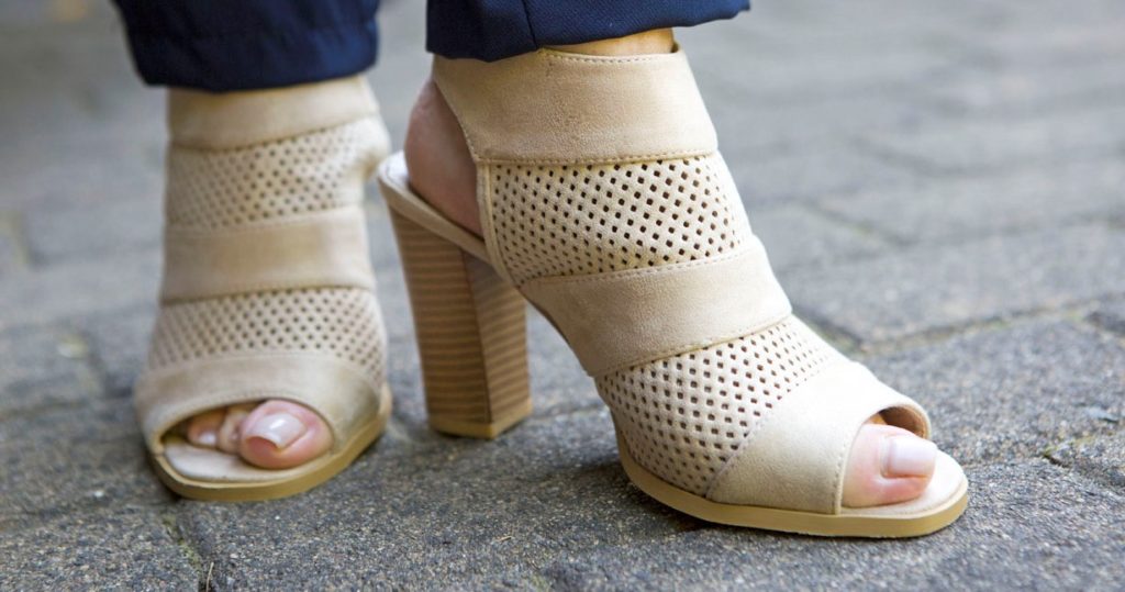 Beżowe buty na wysokim słupku są wyjątkowo wygodne i przyjemne w dotyku.