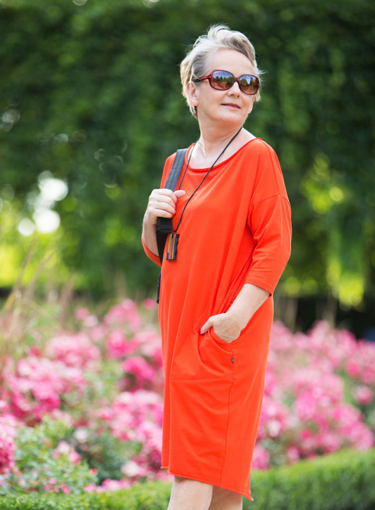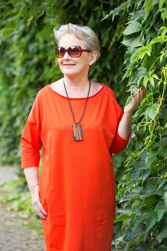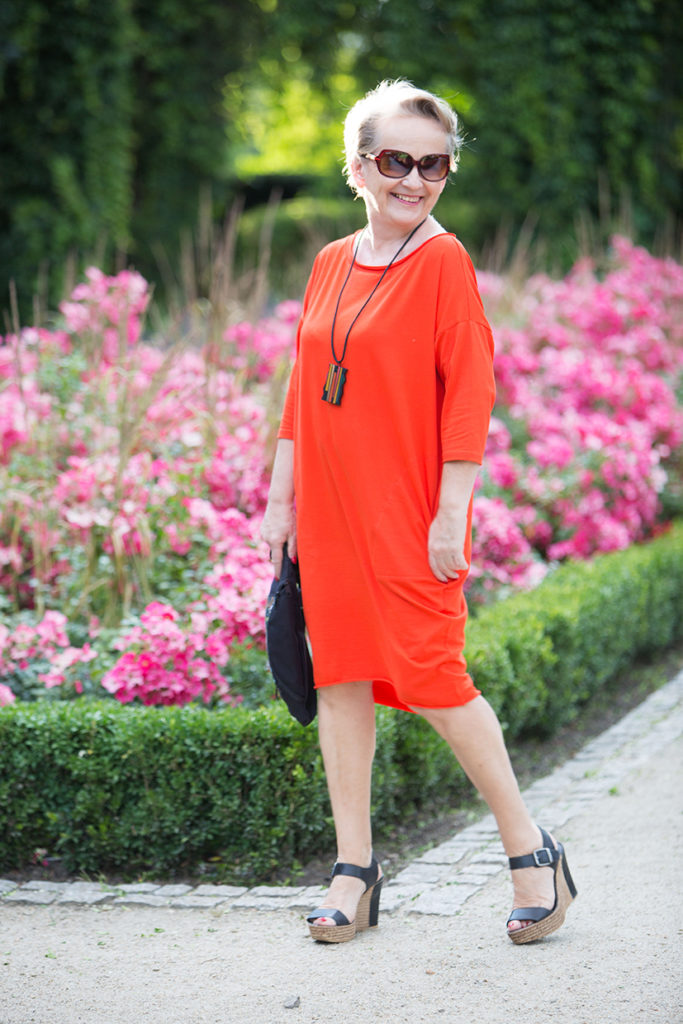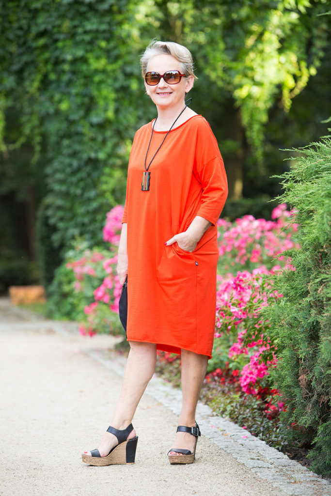 Chciałam Wam dzisiaj pokazać zestaw, który nie jest tym razem romantyczny, a wręcz przeciwnie „posiada pazura”. Intensywny pomarańczowy kolor i nowoczesne dodatki dają w sumie stylizację dość zwracającą na siebie uwagę. Bardzo dobrze czuję się w tym kolorze, dlatego zdecydowałam się właśnie na tę sukienkę.