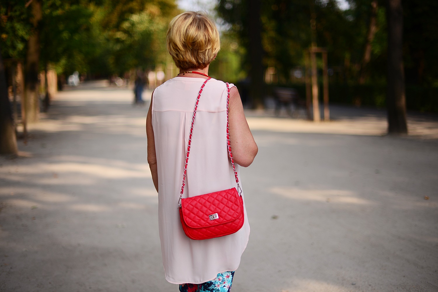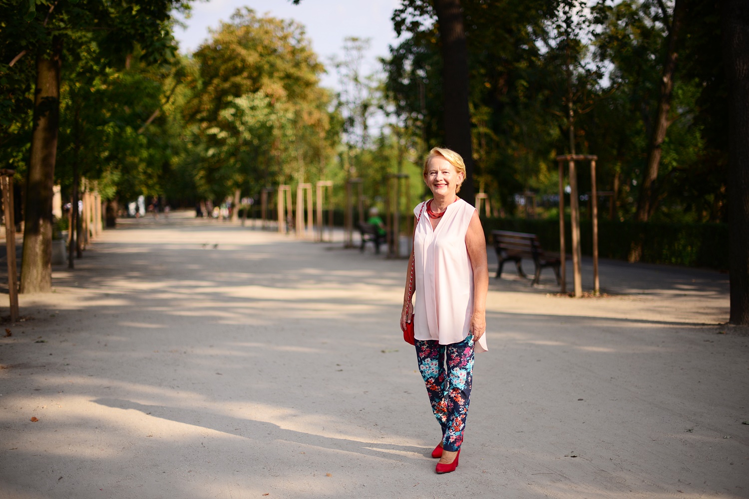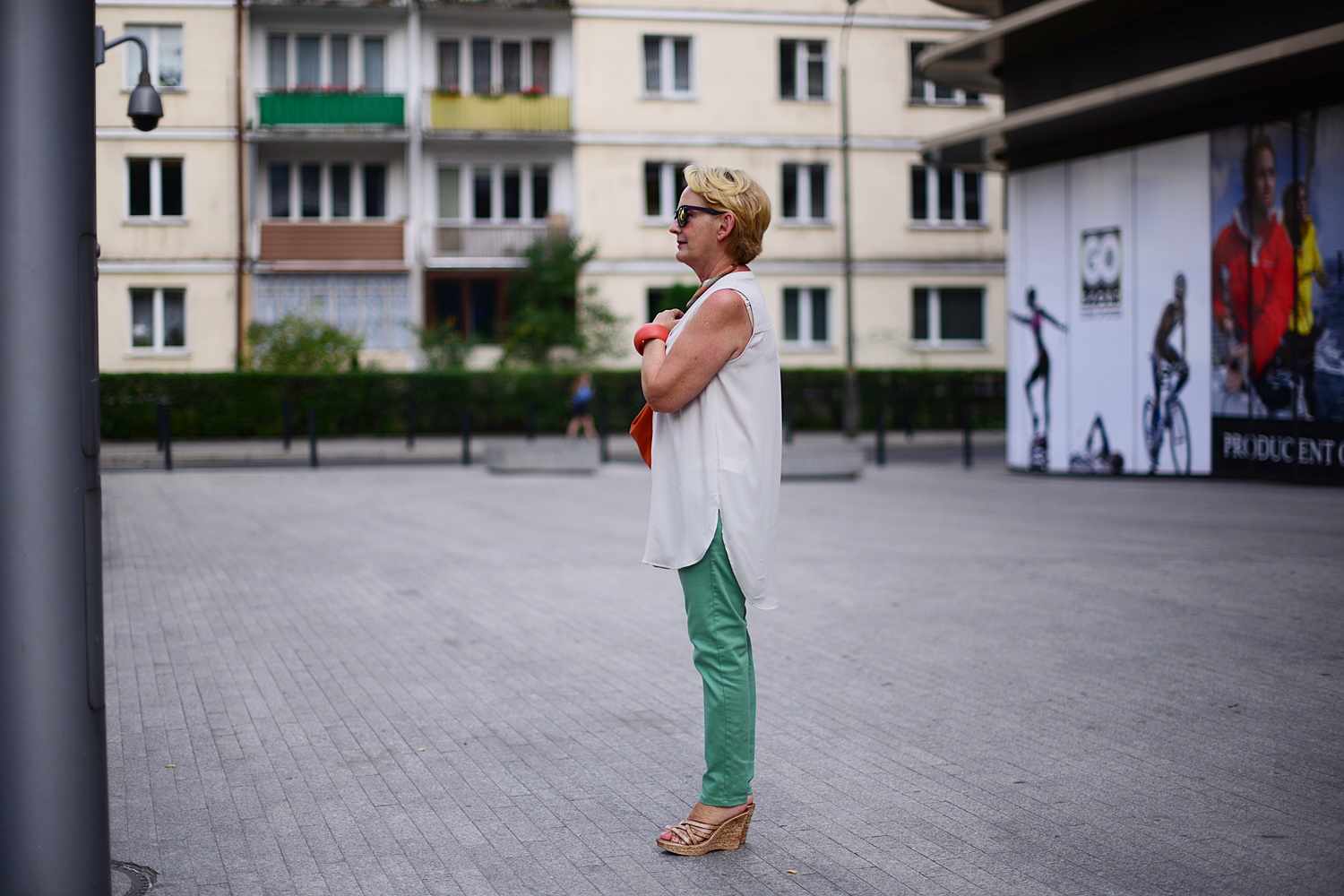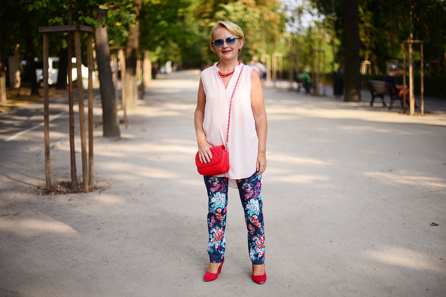 Mam na sobie letnią bluzkę z H&M i kolorowe spodnie, a dodatki są tym razem czerwone. Na zdjęciu poniżej jej druga wersja w kolorze beżowym i zielone spodnie.