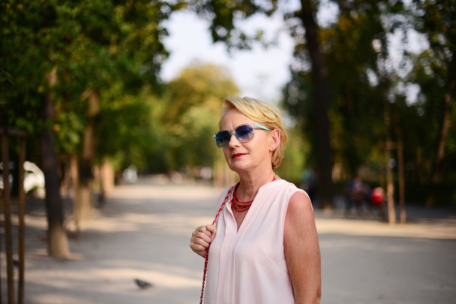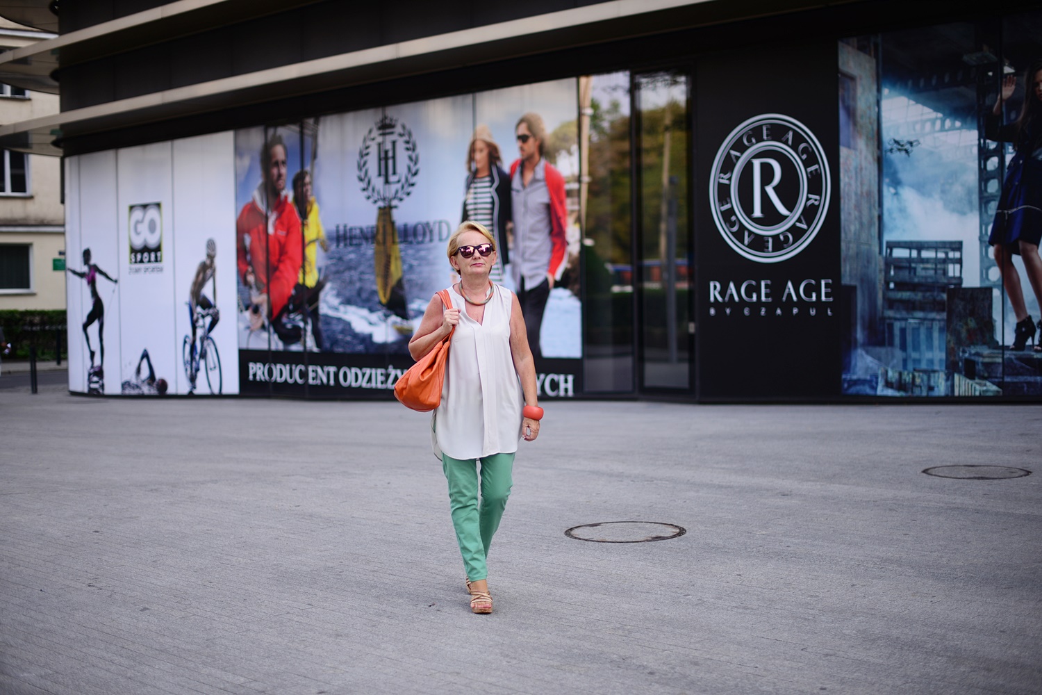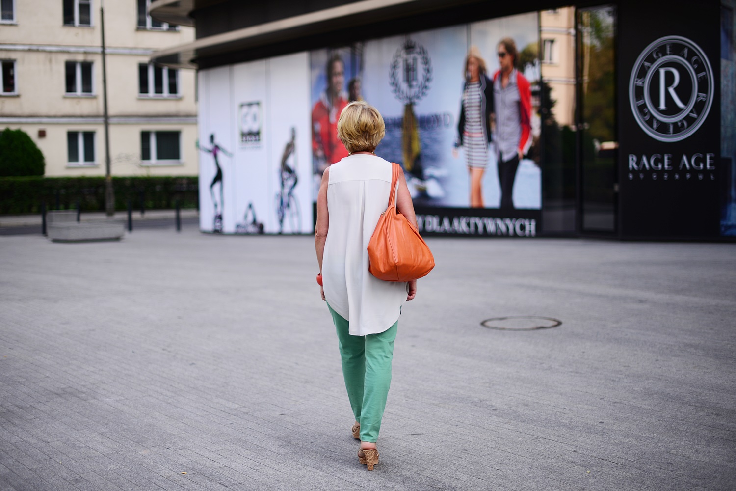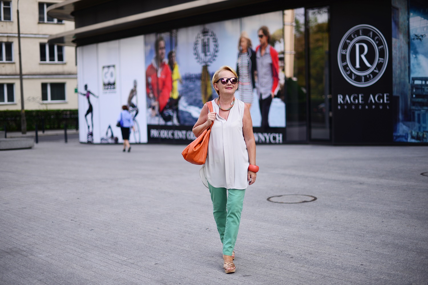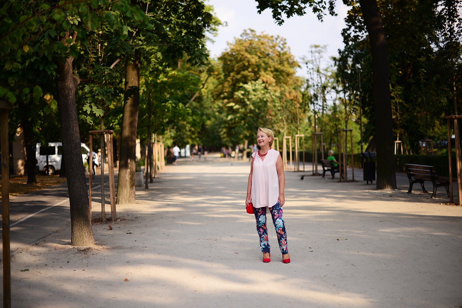 Mam na sobie letnią bluzkę z H&M i kolorowe spodnie, a dodatki są tym razem czerwone. Na zdjęciu poniżej jej druga wersja w kolorze beżowym i zielone spodnie.
