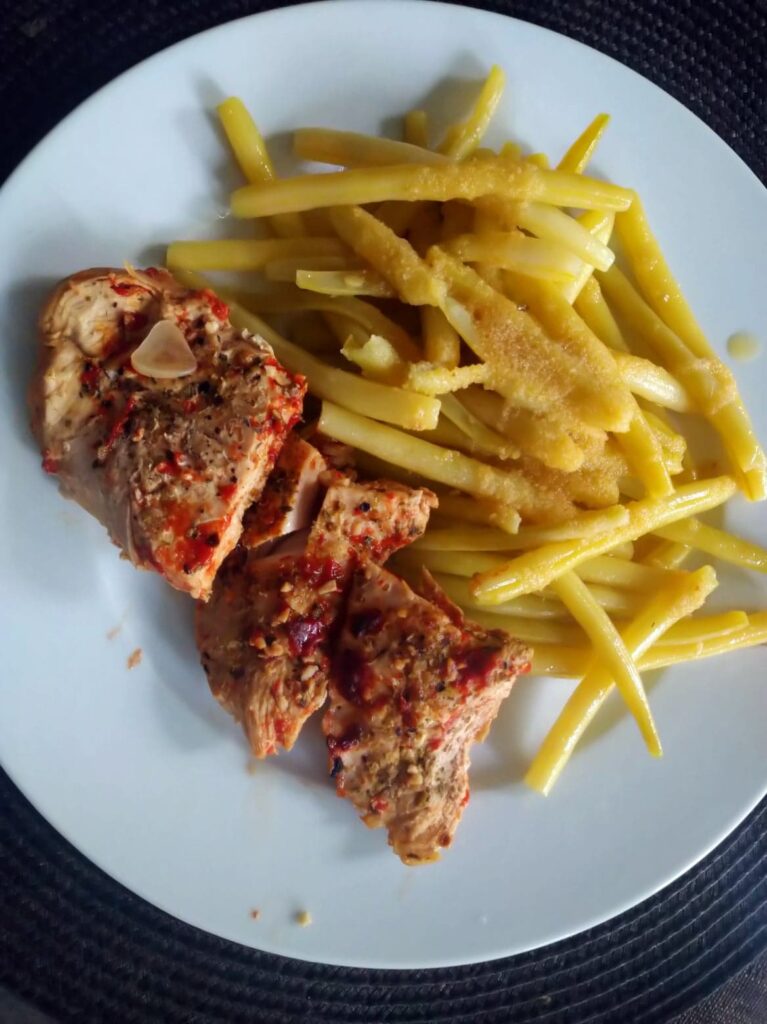 Gdy na obiad jest mięso (powyżej piersi kurczaka przygotowane na parze z przyprawą „zioła toskańskie”), to dodaję do niego na przykład fasolkę szparagową, czy kalafiora.
