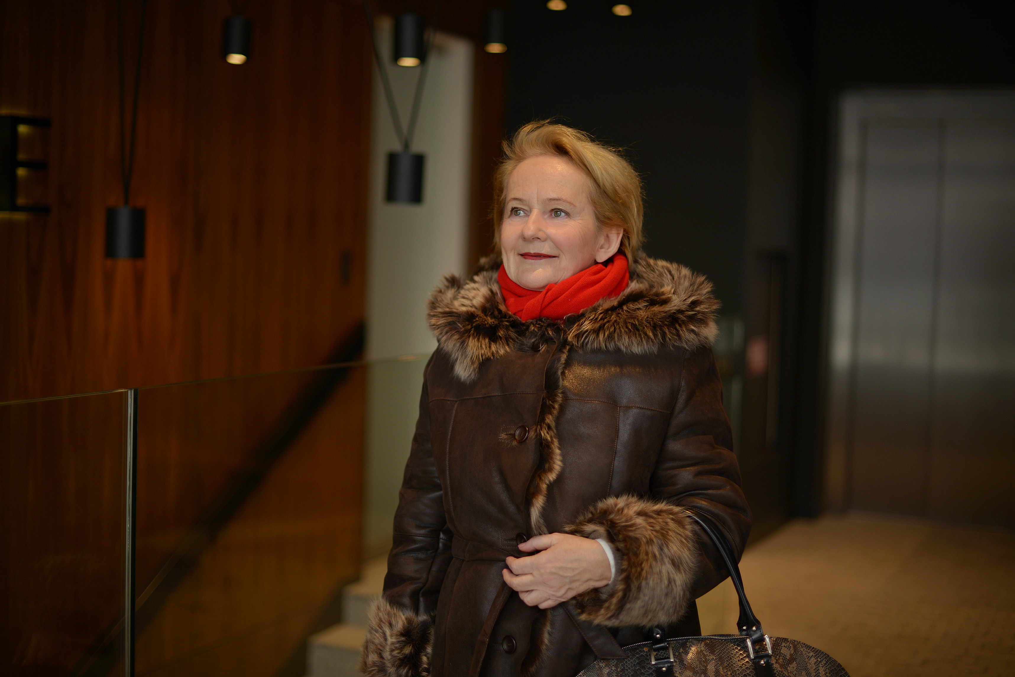 Krótki kożuszek, w którym jestem, jest bardzo ciepły i lubię w nim chodzić, kiedy jeżdżę komunikacją miejską. Ponieważ jest ciemny, nie brudzi się i dlatego, że jest krótki, wygodniej się w nim wsiada do autobusu, czy tramwaju.
