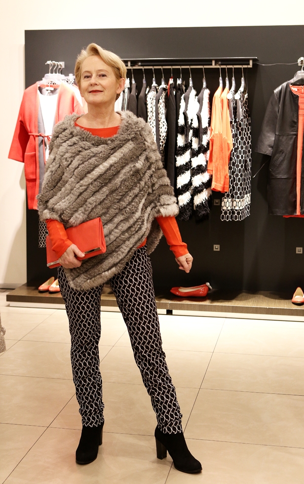A oto, co z niej wybrałam: szare. cieplutkie ponczo, pomarańczowy sweterek, oraz spodnie w czarno-białe wzory.