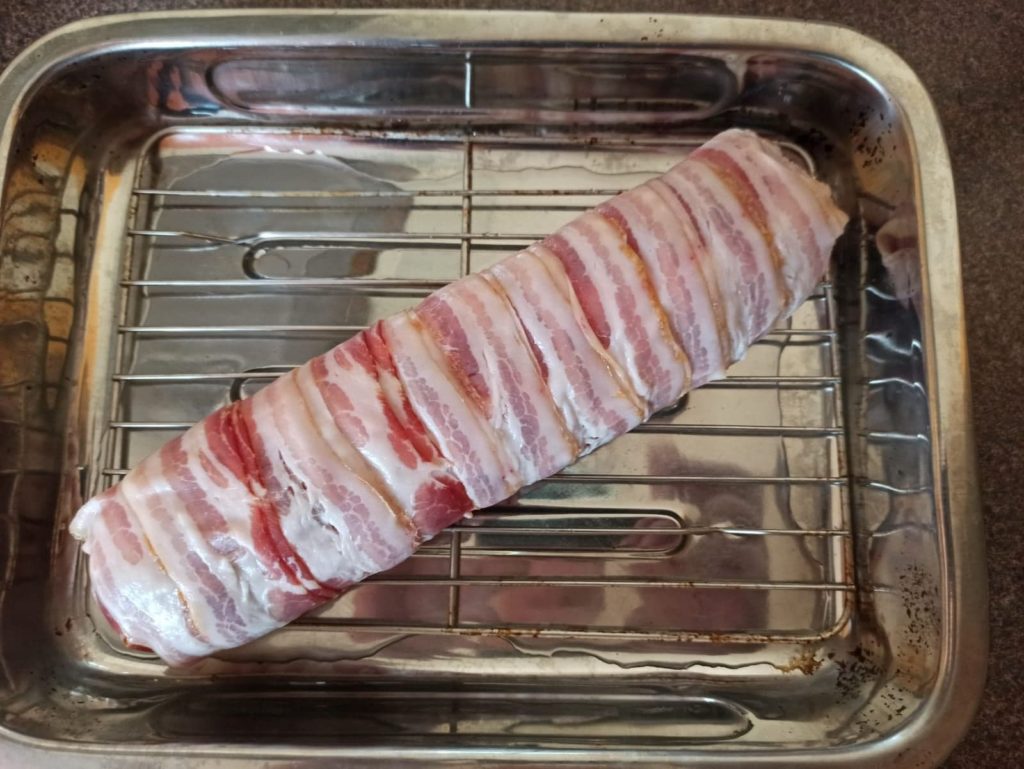 Z tych produktów przygotowujemy rolkę, którą dokładnie owijamy wędzonym boczkiem.