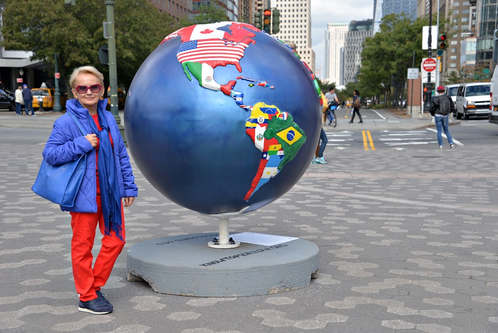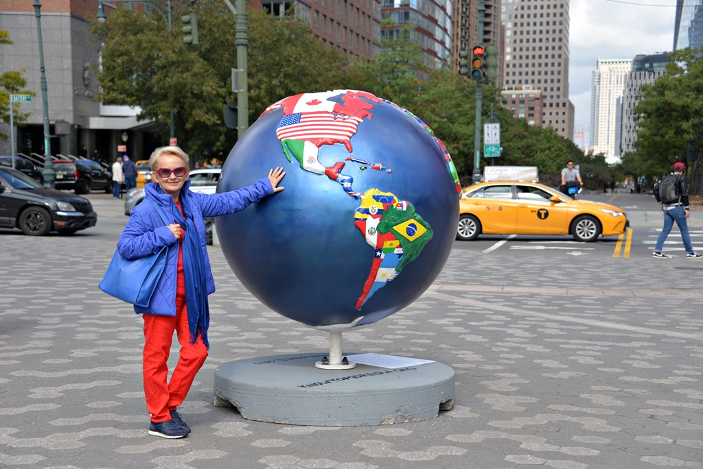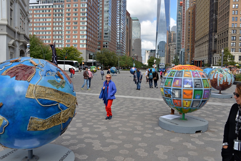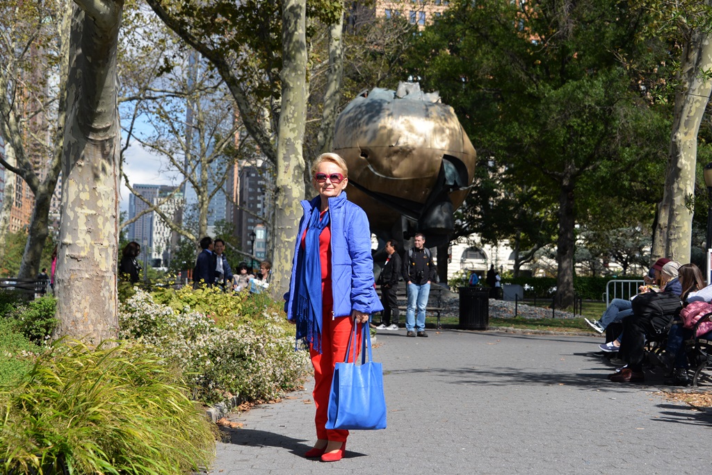 A tutaj w tle metalowa kula, która wczesniej stała koło WTC i uległa tam zniszczeniu podczas ataku terorystycznego. Teraz postawiono ją w tym miejscu (taka zniszczoną) dla upamiętnienia tych tragicznych wydarzeń. Wokół jest kilka zniczy, które cały czas się palą.