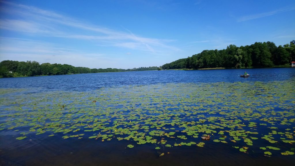 Jedno z dwóch 15 hektarowych jezior i samotny rybak na łódce.