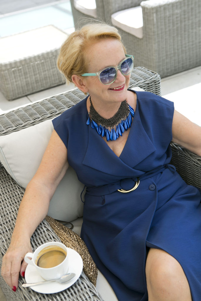 Błękitne okulary przeciwsłoneczne i złota kopertówka mają za zadanie rozświetlić zestaw i nieco go podkręcić.