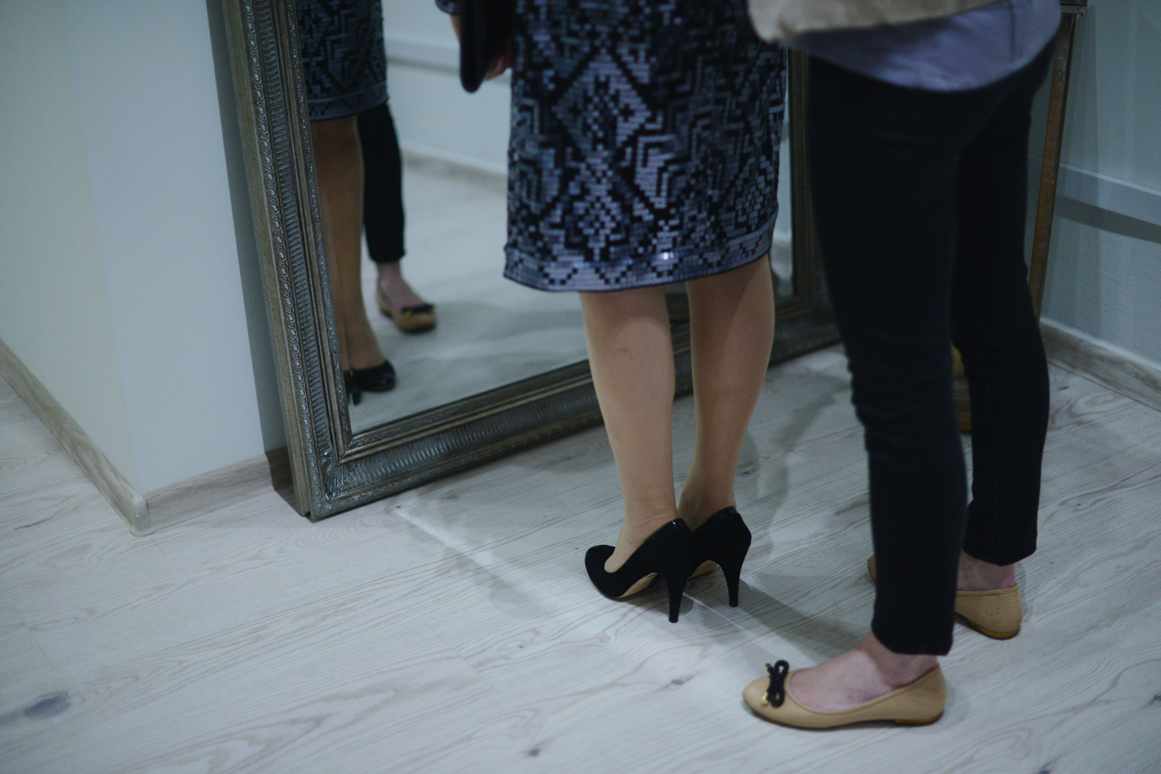 Szpilki z błyszczącymi  noskami, moim zdaniem, nie stworzyły dysonansu z sukienką, ale na bal sylwestrowy lepiej będą pasować w całości czarne.