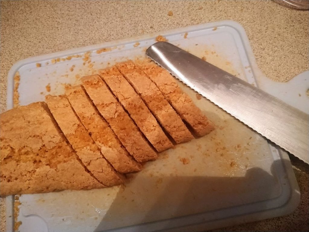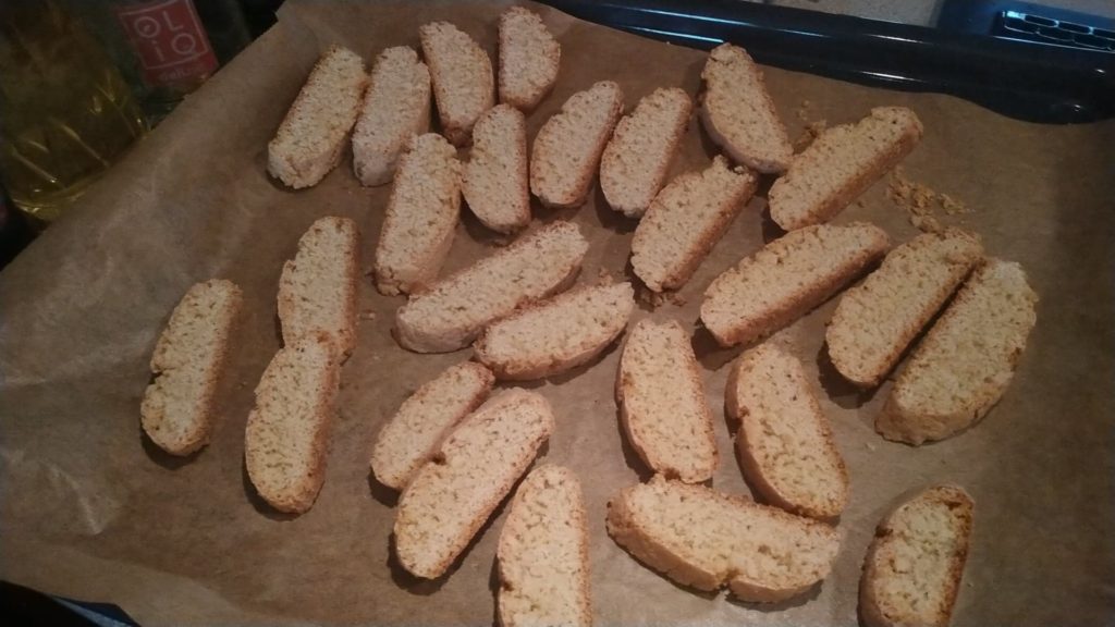 Podaję składniki: 250 g maki pszennej, 150 g cukru, szczypta soli, 2 łyżeczki proszku do pieczenia,(opcjonalnie można także dodać 20 g likieru), 2 jajka, 1 żółtko, 150 g. migdałów ze skórką. Wszystkie składniki wyrabiamy. Na samym końcu dodajemy migdały w całości (ja miałam je tylko w płatkach). Następnie na blasze z papierem do pieczenia formujemy bagietki szer.3 cm i długości ok. 30 cm. Pieczemy w 180 st. przez 30 minut, aż zrobią się złociste. Po upieczeniu ostrym nożem kroimy je na kawałki o grubości 1 cm. Mają niesamowity zapach., któremu nie można się oprzeć. Przechowujemy je w szczelnym pojemniku. Idealnie nadają się do wonnej herbaty, czy kawy.