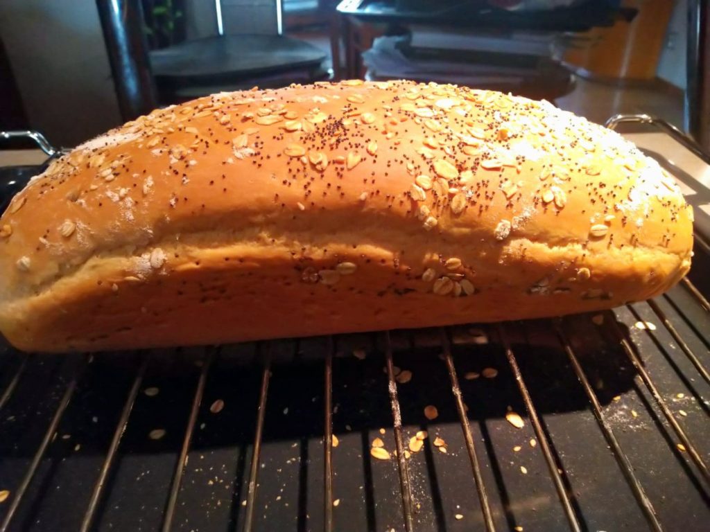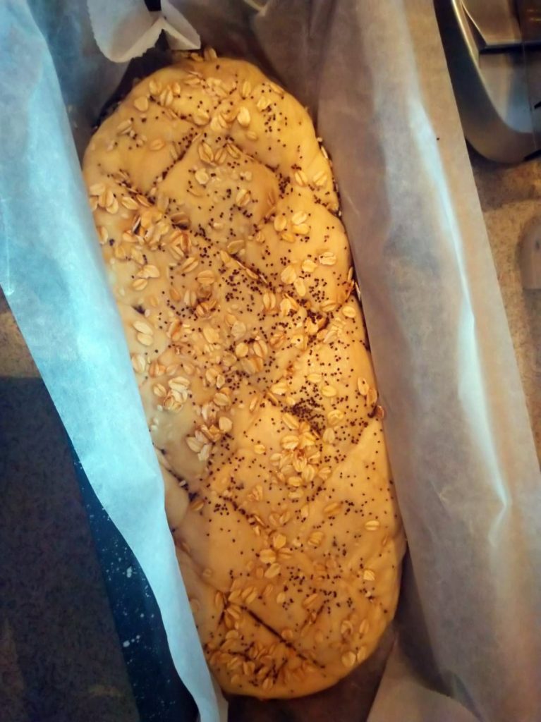 Ciasto wyrabiamy i posmarowane 1 łyżką oleju zostawiamy do wyrośnięcia na 1 godzinę, potem wyrabiamy jeszcze raz, wstawiamy do foremki (10 cm na 30 cm) lub tortownicy, zwilżamy wodą, posypujemy dowolnymi ziarenkami (tym razem posypałam je płatkami owsianymi i makiem) i delikatnie mąką. Nacinamy i zostawiamy na 1 godzinę do wyrośnięcia. Pieczemy w 180 st. 1 godzinę.