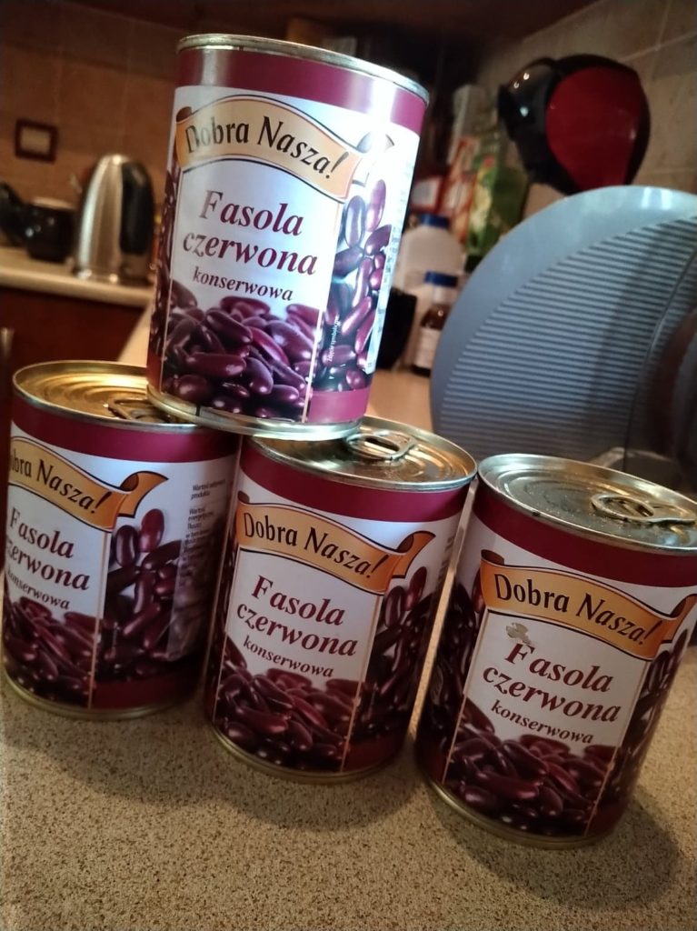 Do potrawy dodaję czerwoną fasolę (ok. 4 puszki), pocięte w kawałki pomidory (3-4 szt.), mięso (ok. 0,5 kg), cebulę ( 2 szt), czosnek (1 ząbek), boczek wędzony (300 g) i kawałek kiełbasy.