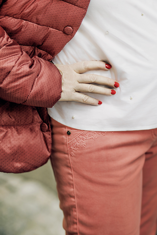 Poza płaszczami, na wiosnę bardzo lubię nosić lekkie, puchowe kurteczki. Bardzo twarzową kupiłam także w salonie OLSEN. Gdy zrobi się nagle ciepło, zawsze można ją zdjąć i schować do torebki, bo nie zajmuje zbyt dużo miejsca.