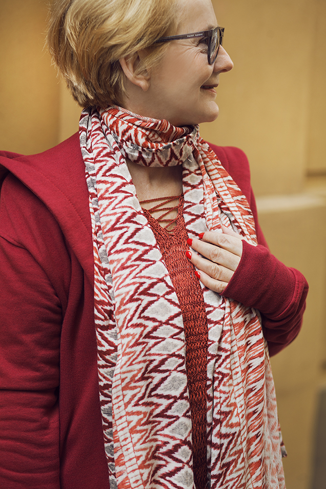 Odpowiednio kolorystycznie dobrałam także szalik. Znalazłam go również w salonie OLSEN.