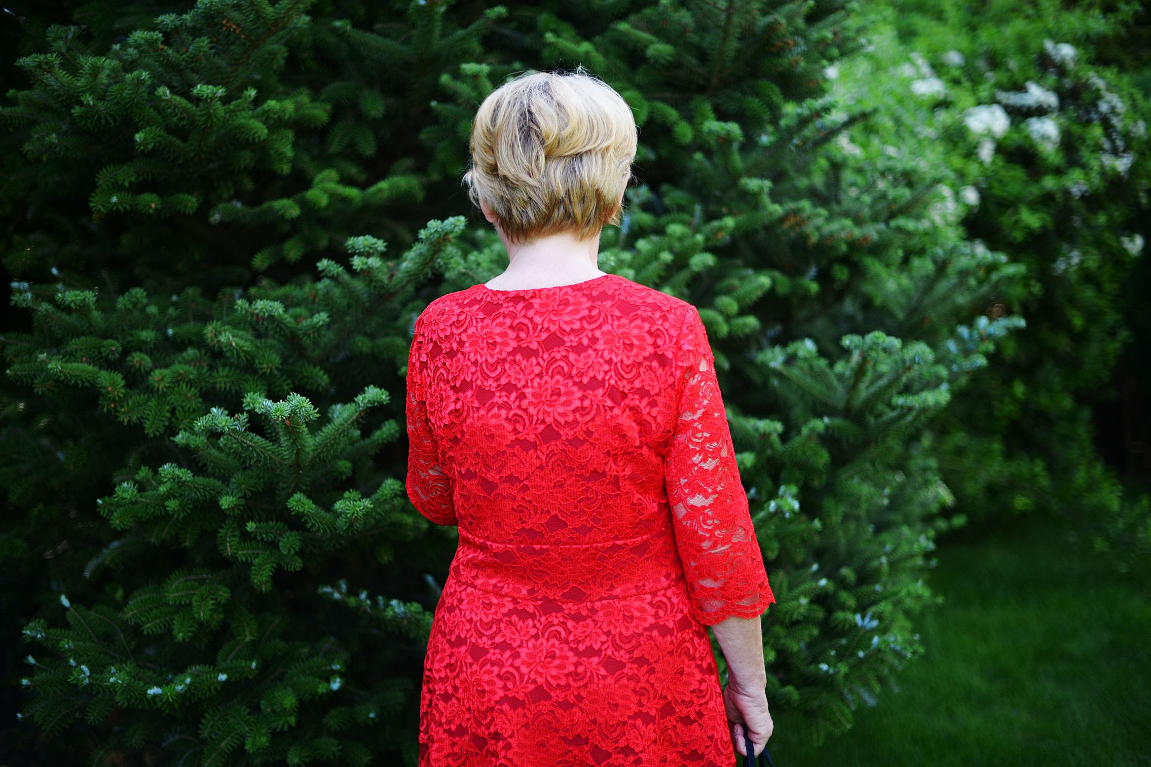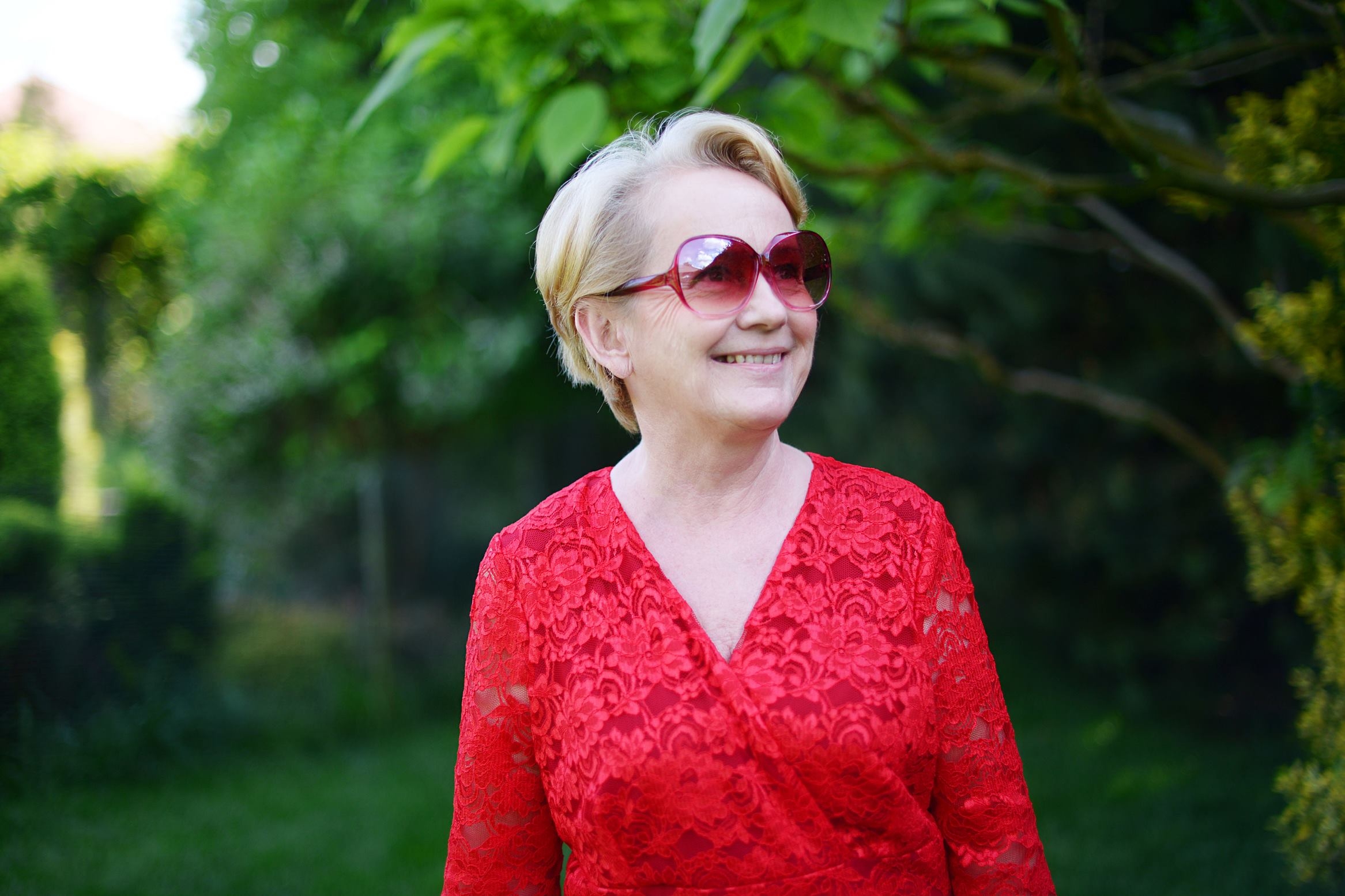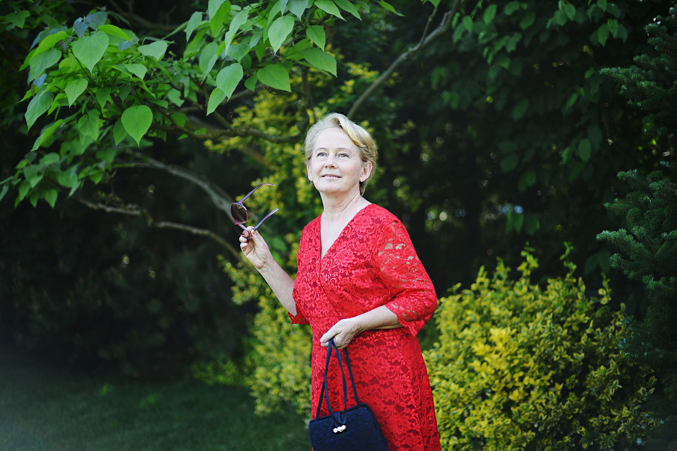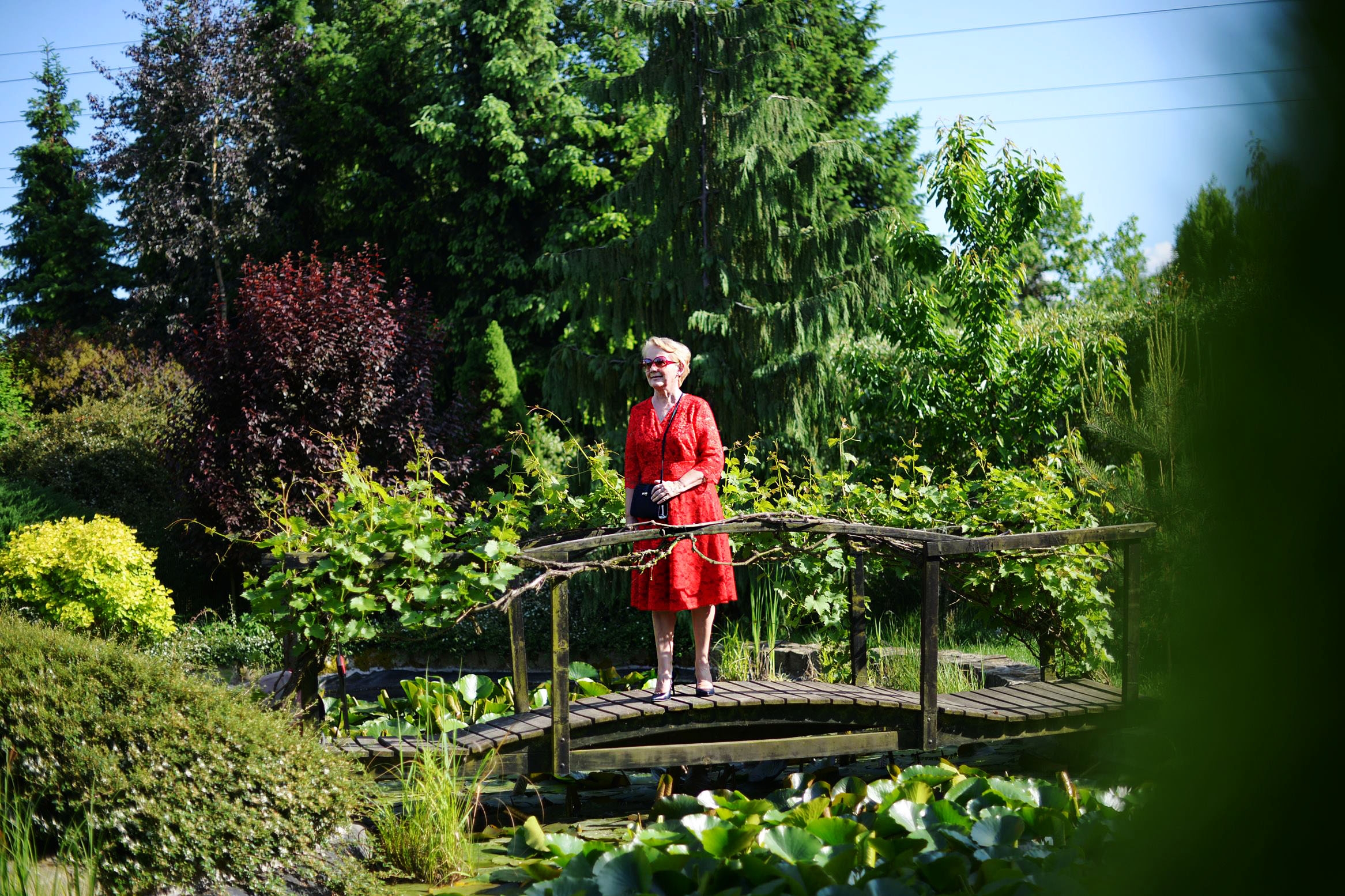 Czerwień sukienki świetnie kontrastuje z zielenią, która o tej porze roku jest soczysta i bardzo intensywna.